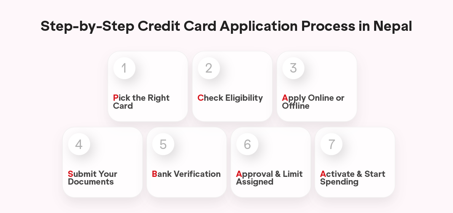 To get a credit card in Nepal, open an account with a bank, submit your citizenship, income proof, and bank statements. If you meet income requirements, the bank reviews your application and issues a card with a set credit limit.